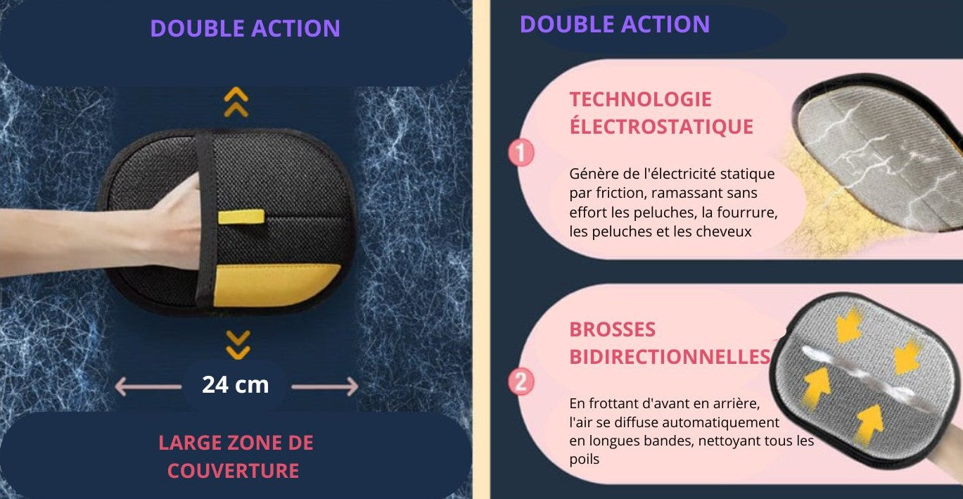Elle est polyvalente : canapés, tapis, lits, coussins, sièges de voiture, vêtements… En un passage, les poils s’accrochent grâce à la technologie électrostatique.